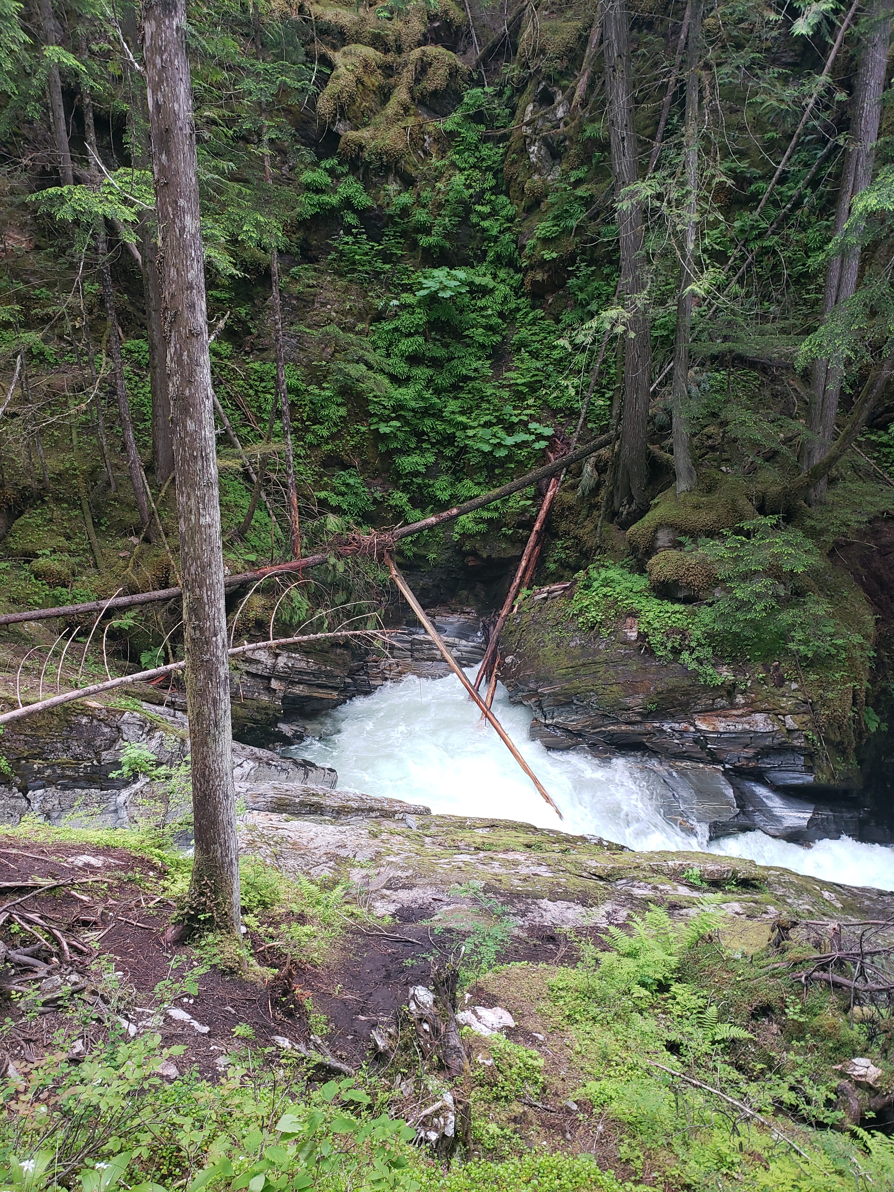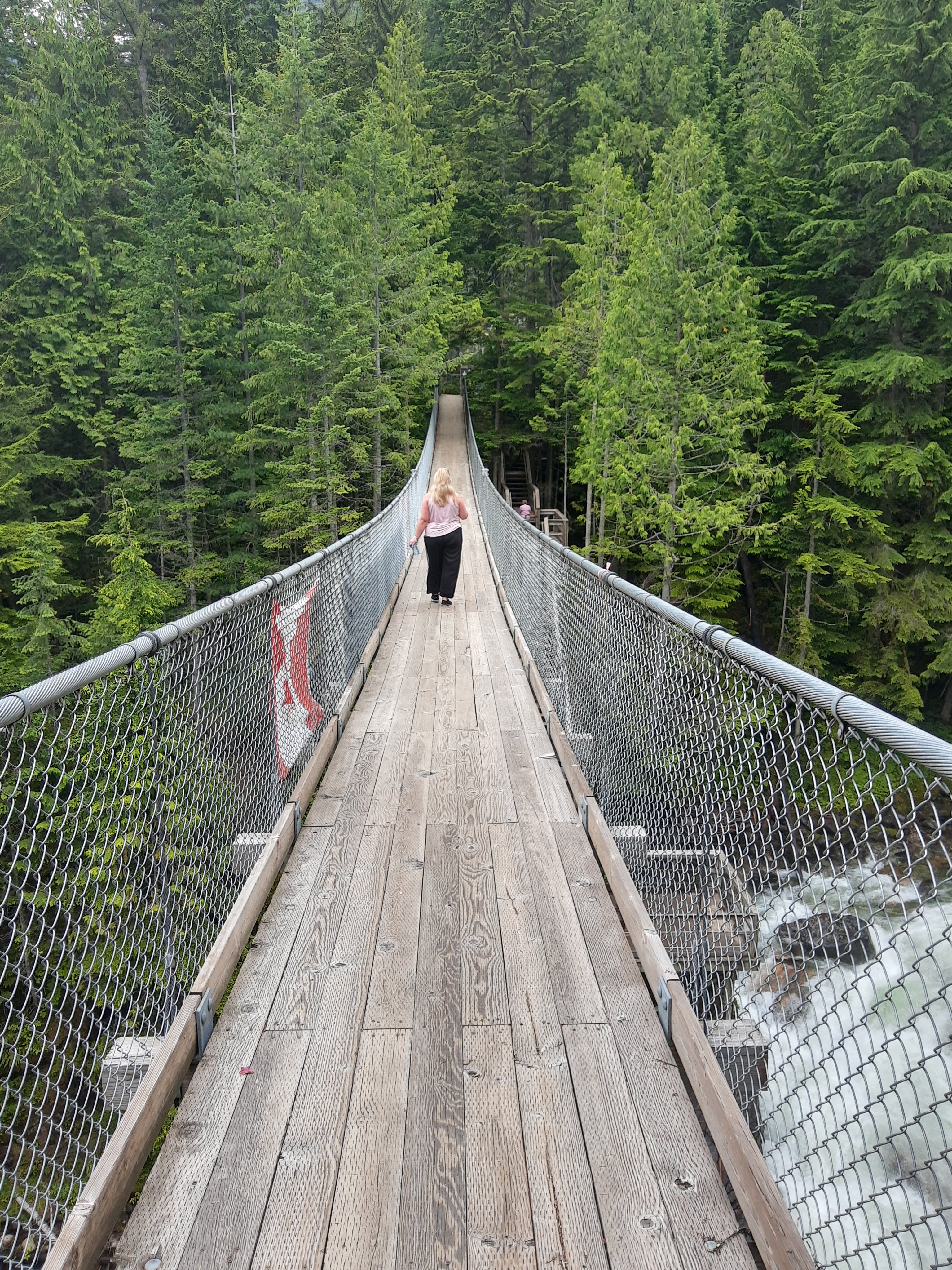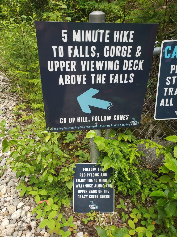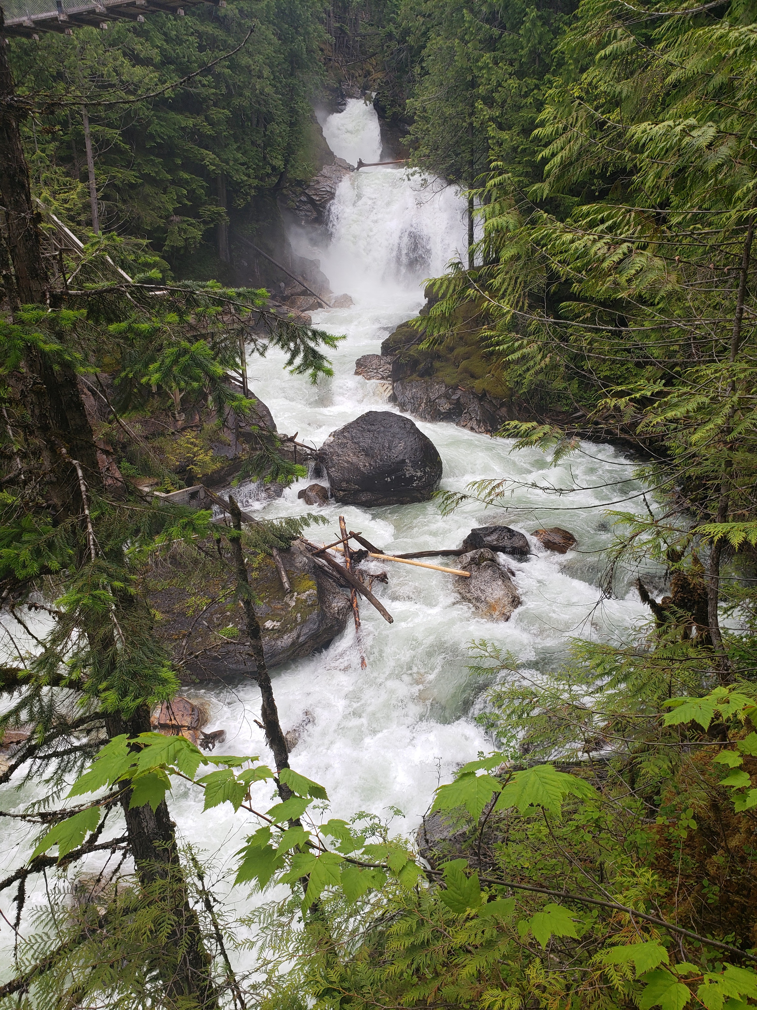 I hope you like stairs, because to get to this gem, you have to climb them. Lots of them. (but the nice thing is what goes up, must come down, so the exit is easier!) When you reach the top of the stairs, you’ll pay a small fee to enter. This allows you to walk the 240m suspension bridge over the gorge, the viewing platforms, and the short hike to the top. The waterfall is absolutely magnificent. The water was rushing when I visited, probably due to the massive amounts of rain BC experienced early this summer. The sheer force of the water is a sight to behold. Note that you WILL get sprayed, which was very welcomed by me as the temperatures were in the 30s when I was there. Then, this happened…